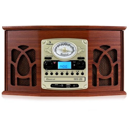 Auna NR-620 Retro Record Player System (CD Player, MP3 / USB / SD Connectivity, Tape Deck & Radio) - Brown - The Auna NR-620 is a versatile stereo system that brings together both traditional and modern functional requirements in a neo-gothic design.A focal piece of the system is its turntable located underneath the grained wood cover. Together with the side cassette deck and MP3-compatible CD player,